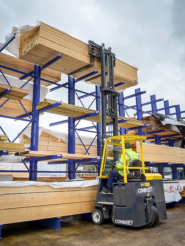 The Combilift-CB forklift, available with lift capacities of up to 4 ton and with electric, diesel or LPG power options, were the first on the market to combine compact counterbalance design with multi-directional capability. Aimed at operations needing to handle mixed loads, they are ideal for builders merchants who tend to stock a diverse range of products. Its versatility enables it to load, offload and move 6 metre long bundles of timber, lengths of plasterboard as well as pallets of bricks, blocks and cement.
